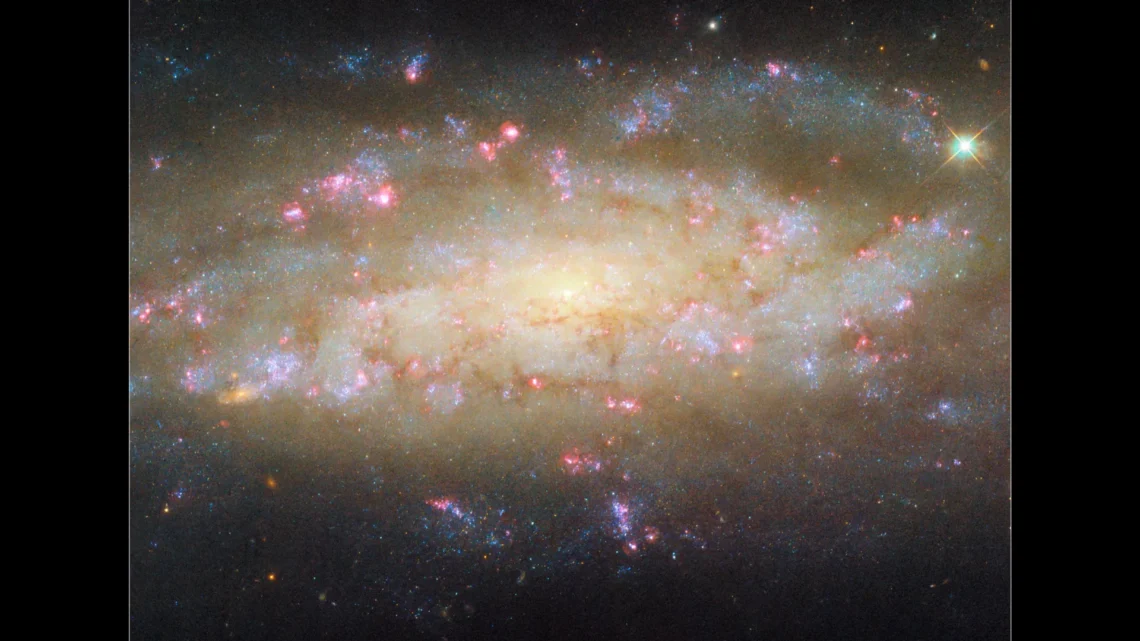 This image showcases the galaxy’s intricate patchy spiral arms, interspersed with clumps of dark, obscuring dust. It also reveals vibrant pink regions, which are rich in gas and serve as nurseries for new stars. These young stars illuminate the surrounding clouds, causing the gas to glow with a characteristic red light. The Hubble program, dedicated to studying stellar activity like this, tracks the formation of new stars, hydrogen clouds, and star clusters to understand the galaxy’s evolution over time.